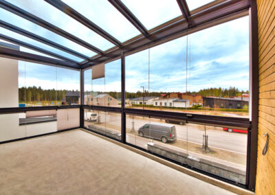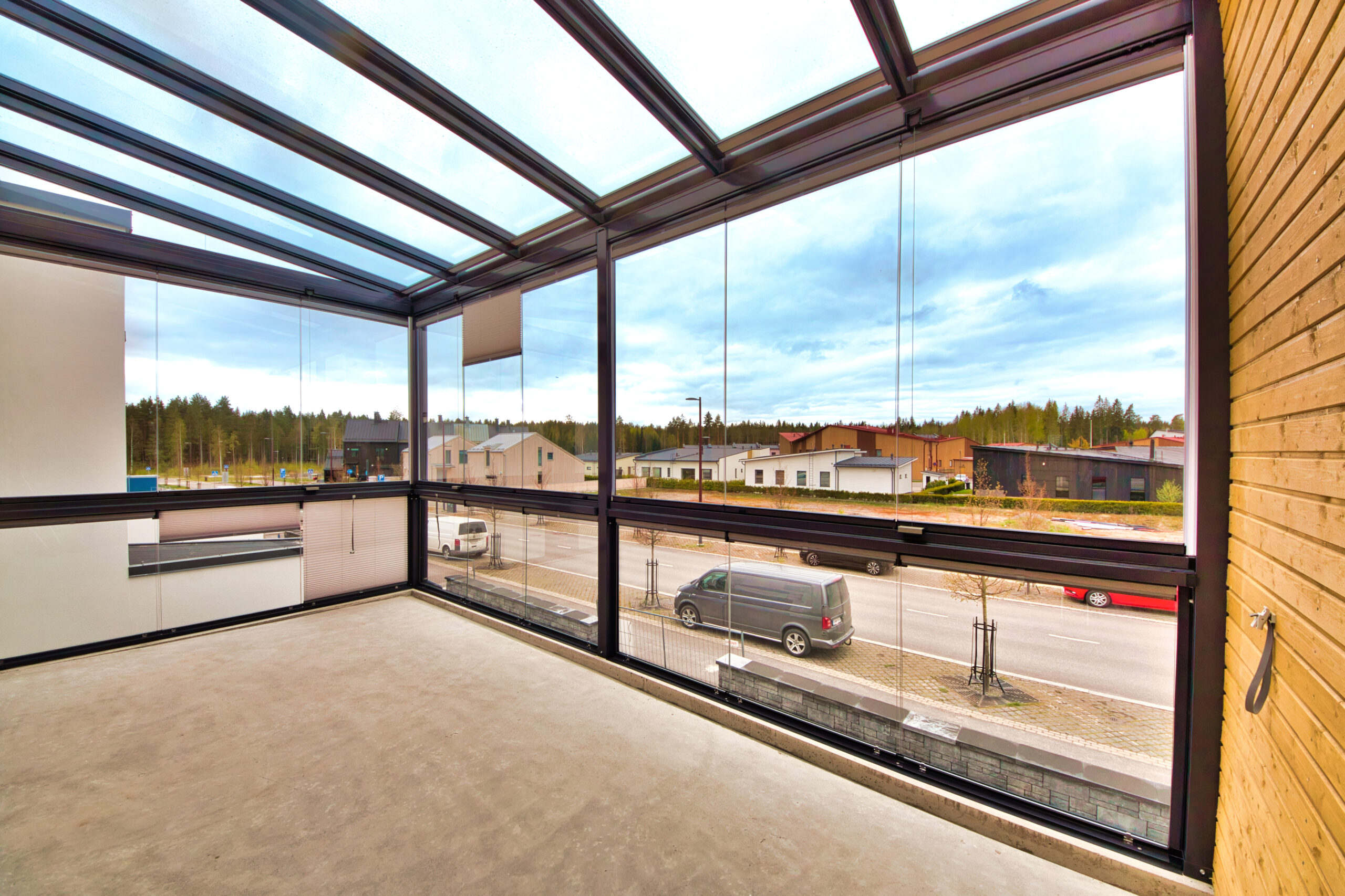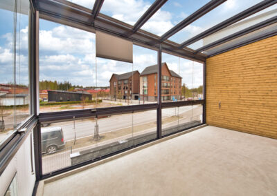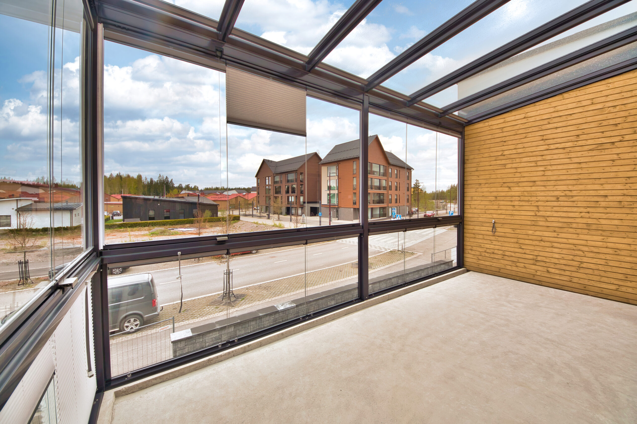 Avokeittiö ja olohuone muodostavat yhtenäisen tilan, jota valaisevat suuret lounaaseen avautuvat ikkunat. Lasiliukuovesta pääset oleskelutilasta terassille ja omalle helppohoitoiselle pihalle, josta on käynti puistolehmusten reunustamalle kävelytielle.