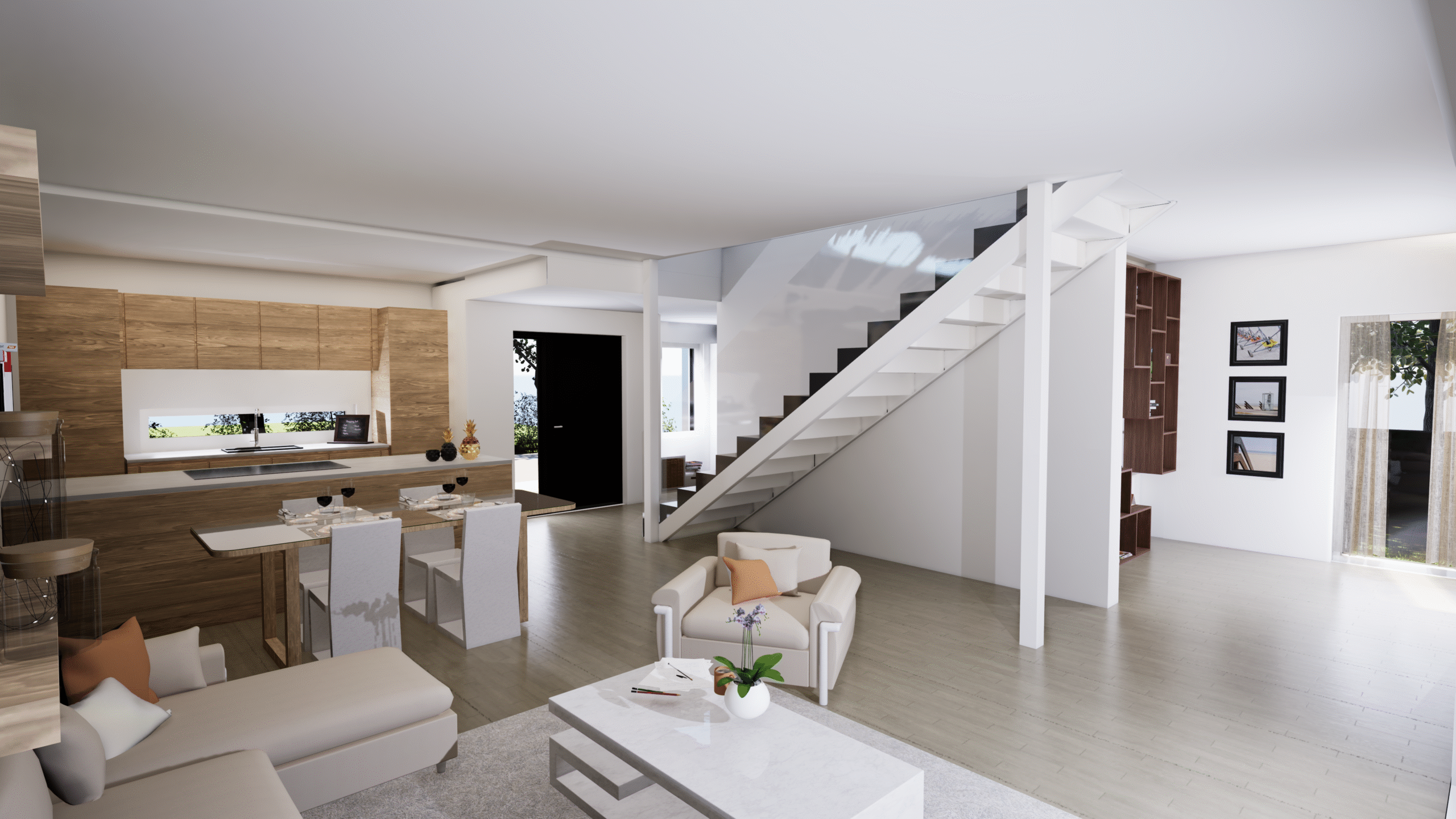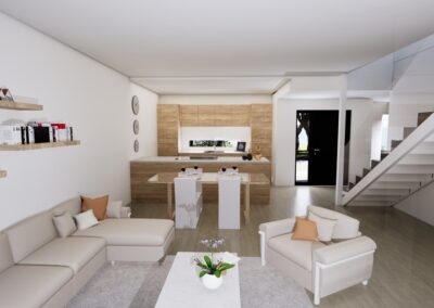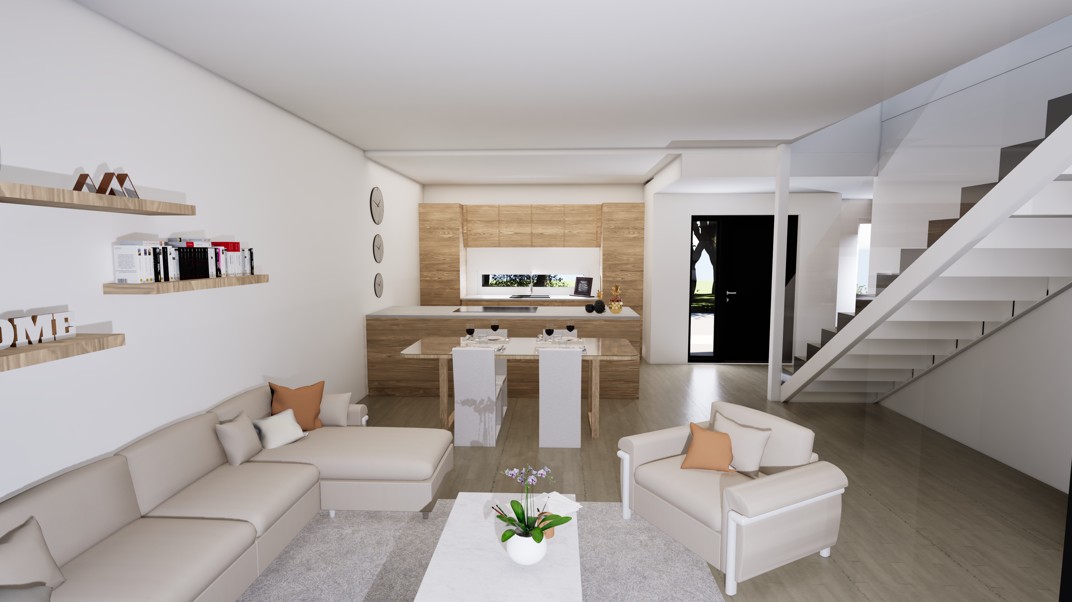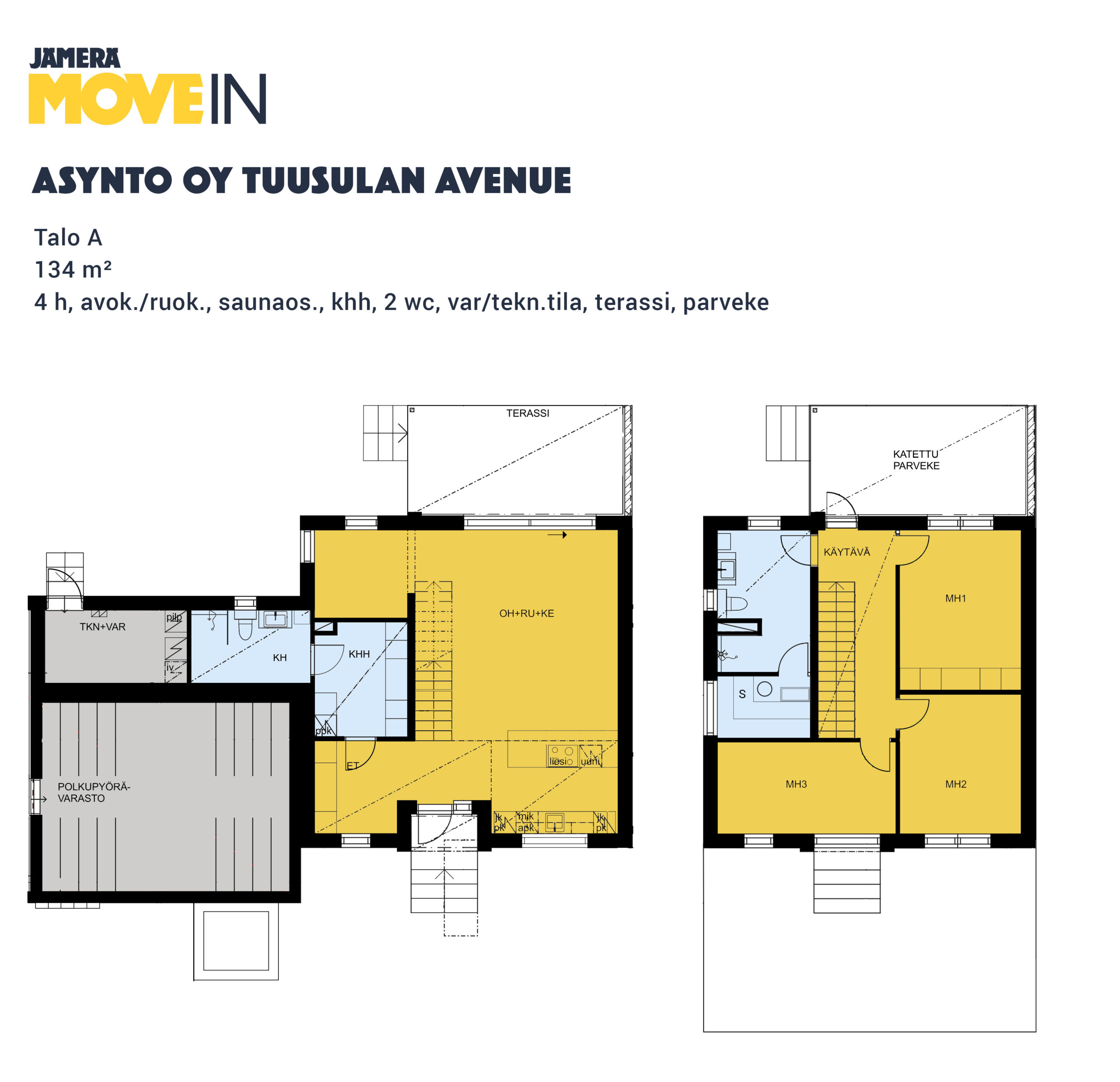 Townhouse-talo A on 134 m² kokoinen päätyasunto, joka yhdistää avaruuden, toimivuuden ja yksityisyyden. Kodin sydämen muodostavat avokeittiö, ruokailutila ja olohuone, joiden suuret ikkunat ja päätyaseman lisäikkunat tuovat upeasti luonnonvaloa sisään. Tilavalle, katetulle terassille avautuvat näkymät tekevät arjesta nautinnon – paikka aamukahville, grilli-illoille tai vain rentoutumiselle.