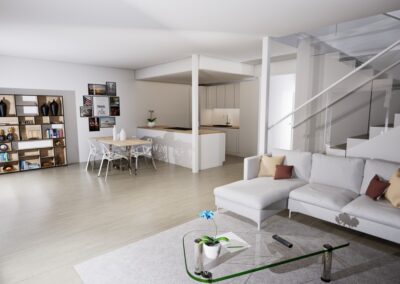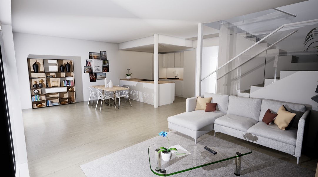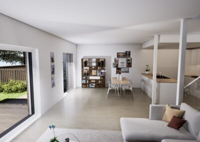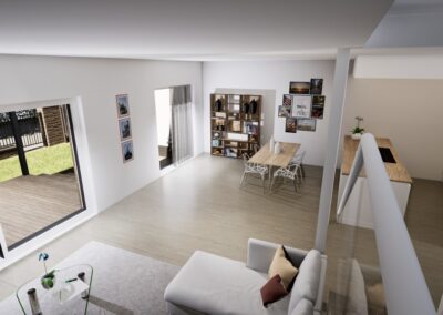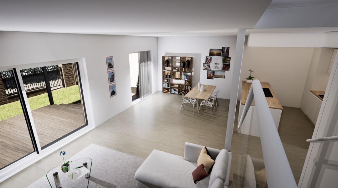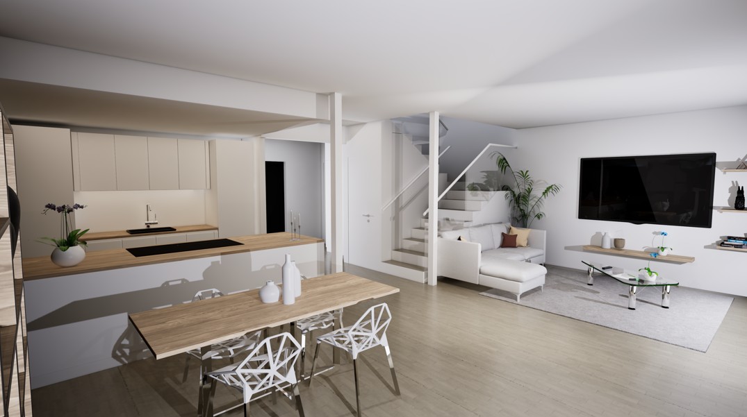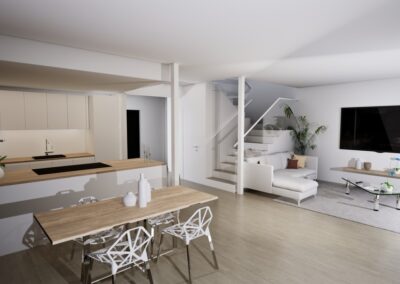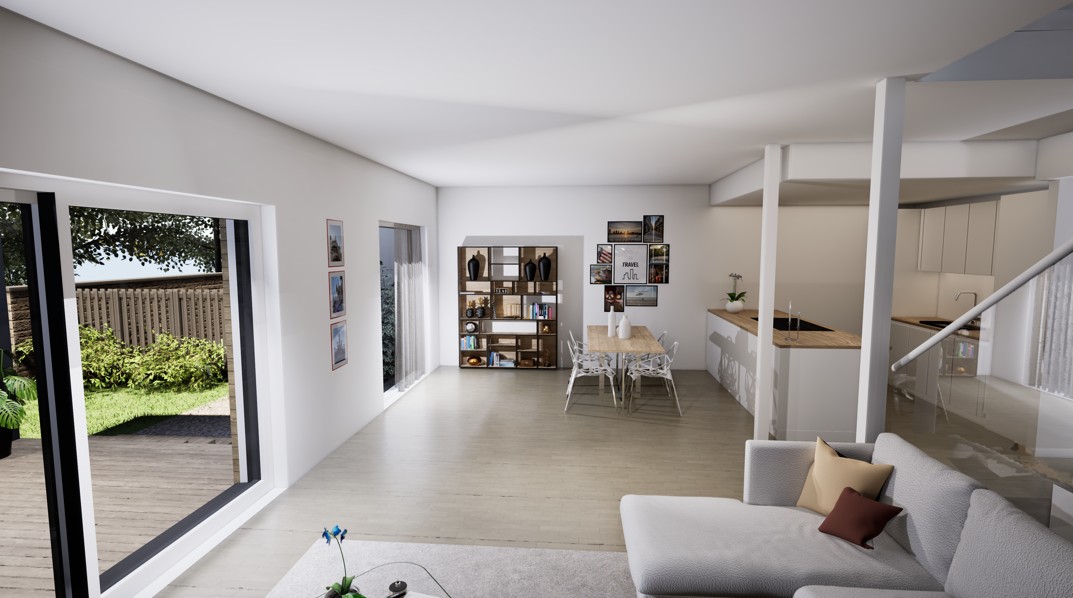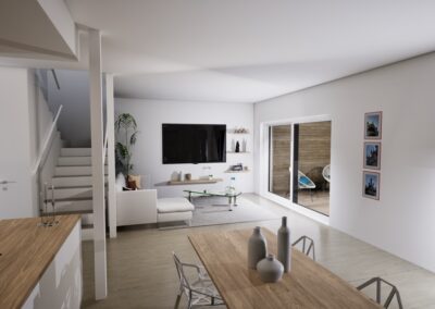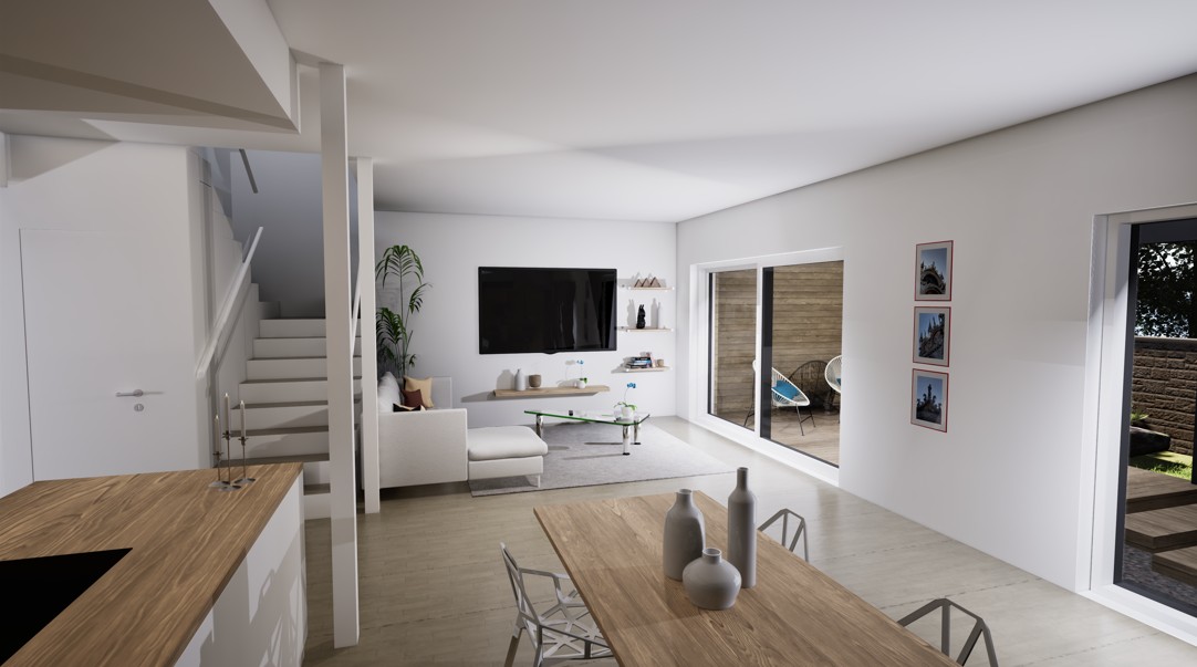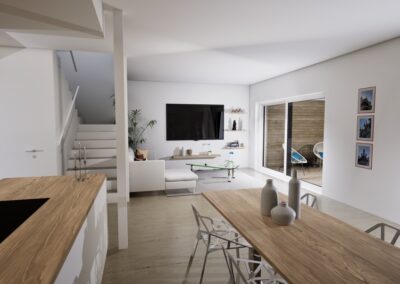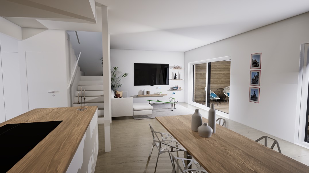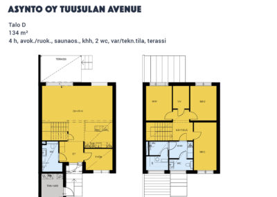 Townhouse-talo D tarjoaa 134 m² modernia ja harkittua asumista kahteen kerrokseen jaettuna. Kodin sydämen muodostaa ensimmäisen kerroksen valoisa olohuone, ruokailutila ja avokeittiö, joista on suora yhteys katetulle terassille. Suuret ikkunat tuovat sisään luonnonvaloa ja tekevät arjesta avaraa ja viihtyisää.
